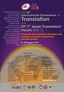 La Universidad de Ciencias de Malasia (USM) acoge este año la XIV Conferencia Internacional sobre Traducción que tendrá como temática central la formación de traductores e intérpretes (Translator and Interpreter Training: Innovation, Assessment and Recognition). La conferencia tendrá lugar en Penang del 27 al 29 de agosto de 2013 y está coorganizada por la USM, la MTA (Malaysian Translators Association), el ITBM (Malaysian Institute of Translation and Books) y el DBP (Institute of Language and Literature), bajo el patrocinio del Ministerio de Eduación Superior y el Ministerio de Educación de Malasia. Podéis consultar la información sobre la conferencia aquí.